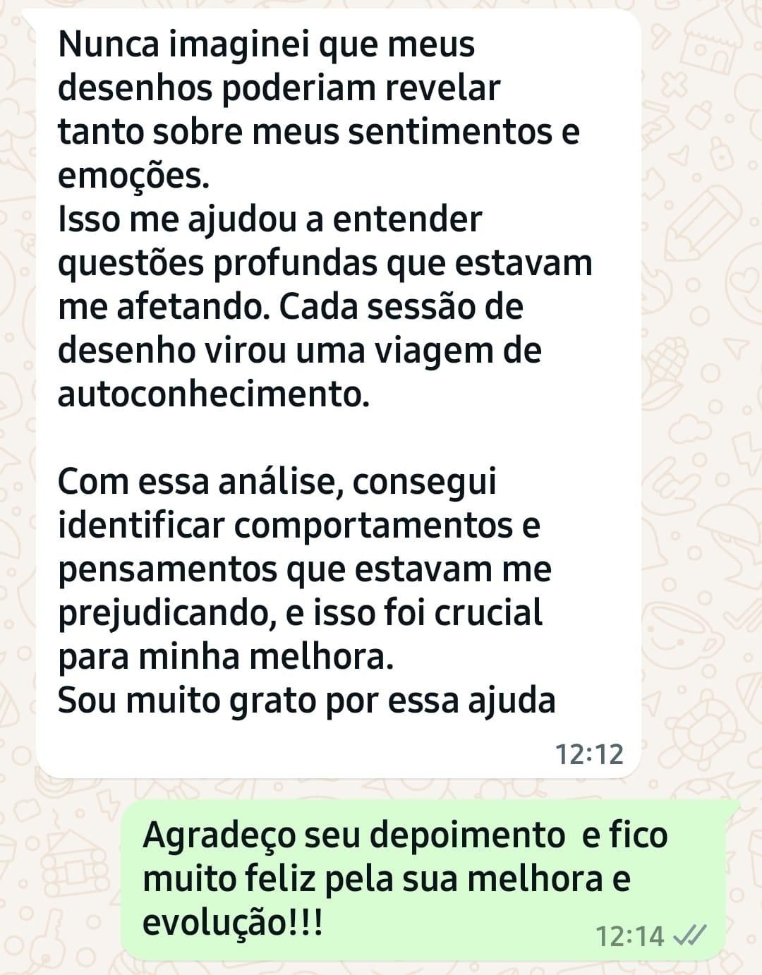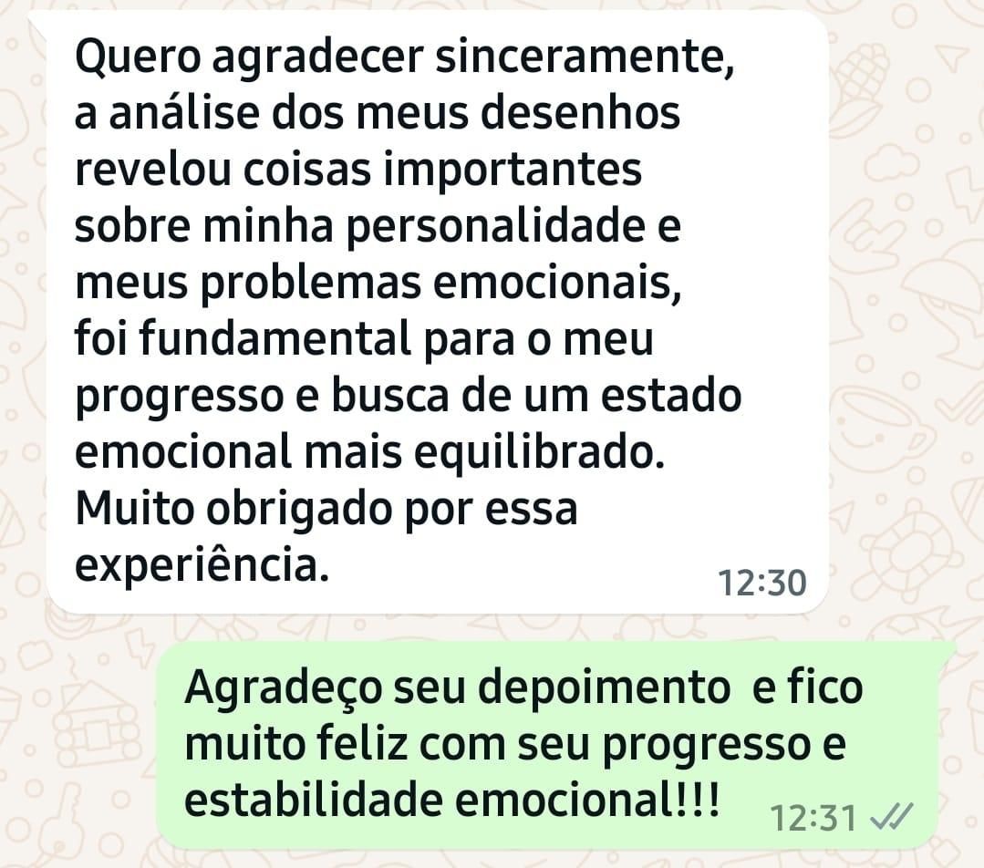 Será feito um diagnóstico do desenho completo, informando cada elemento analisado, seus significados, fazendo sempre que possível as correlações e interpretações entre esses elementos, tudo será colocado em forma de um relatório por escrito e os destaques que forem necessários.